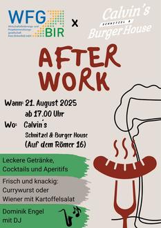 Nach dem erfolgreichen Auftakt lädt die Wirtschaftsförderungsgesellschaft (WFG) des Kreises Birkenfeld am Donnerstag, den 21. August 2025, herzlich zum zweiten After Work Event ein. Die Veranstaltung beginnt um 17:00 Uhr und findet dieses Mal in entspannter Atmosphäre bei Calvin’s Schnitzel & Burger House statt.