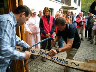 Die Eröffnungszeremonie der Nohener Nahe-Schleife vor zehn Jahren mit dem damaligen Bürgermeister Norbert Helm und dem damaligen 1. Beigeordneten der Verbandsgemeinde Birkenfeld, Holger Noss. Auch in diesem Jahr wird groß gefeiert und jeder ist eingeladen mitzufeiern!
