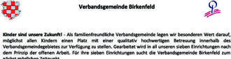 Kinder sind unsere Zukunft! - Als familienfreundliche Verbandsgemeinde legen wir besonderen Wert darauf, möglichst allen Kindern einen Platz mit einer qualitativ hochwertigen Betreuung innerhalb des Verbandsgemeindegebietes zur Verfügung zu stellen. Gearbeitet wird in all unseren sieben Einrichtungen nach dem Prinzip der offenen Arbeit. Für ihre sieben Einrichtungen sucht die Verbandsgemeinde Birkenfeld zum nächst möglichen Zeitpunkt