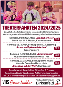 Die Volkshochschule Baumholder bietet mit Unterstützung der Verbandsgemeinde Birkenfeld auch in der Saison 2024/25 wieder aufregende Theaterfahrten an. Kulturinteressierte dürfen sich auf ein abwechslungsreiches Programm freuen, das die Zuschauer mit Oper, Ballett, Schauspiel und musikalischen Darbietungen verzaubern wird.