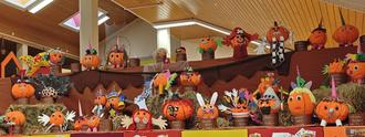 Die Ergebnisse können sich wirklich sehen lassen: Es entstanden die tollsten, lustigsten, kreativsten und individuellsten Kürbisse. Diese wurden im Flurbereich mit Stroh und passender Herbst- und Halloweenkulisse präsentiert, sodass sich alle Besucher und Kinder an den wunderbaren Kreationen erfreuen können. Zu bestaunen gab es unter anderem Einhörner-, Geister-, Meerjungfrauen-, Hexen-, Schlangen-, Piraten-, Feen-, Monster-, Skelett-, Hasen-, Ritter-, Monstertruck-, Chase-, Braut- und Bräutigam-Kürbisse und sogar einen „lieben“ Kürbis.