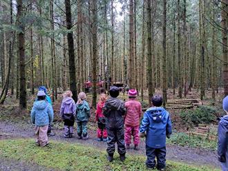 Die Kinder der Waldgruppe der Kita Schwollen erlebten dieser Tage ein besonderes Abenteuer im Wald: Ganz aus der Nähe durften sie beobachten, wie ein Harvester – ein riesiger Forstvollernter – bei der Arbeit war. Mit großen Augen verfolgten die Kinder, wie die mächtige Maschine die Bäume erntete, sie in wenigen Sekunden entastete und die Stämme auf die richtige Länge zusägte.