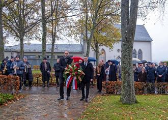 Am Ehrenmal auf dem Friedhof erfolgte die Kranzniederlegung. Die evangelische Pfarrerin Jennifer Breuer und der katholische Pastor Christoph Eckert sprachen dazu Segensworte. Zum Abschluss intonierte der Musikverein die Europahymne, die „Ode an die Freude“ von Ludwig van Beethoven.