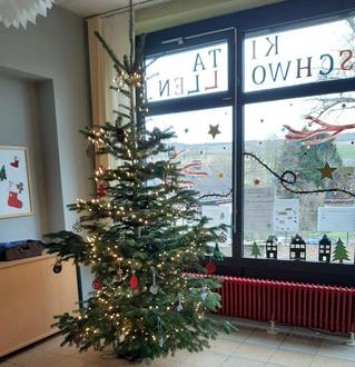 Die Kita Schwollen darf sich auch in diesem Jahr über einen besonders schönen Tannenbaum in der Eingangshalle freuen.