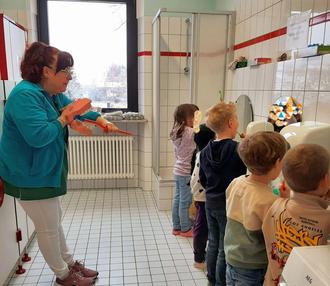 Die „Zahnarztpraxis Maiwiese 2“ war zu Gast und brachte viel gute Laune mit. Die engagierte Zahnarzthelferin Tine Bier, die sichtlich Freude am Umgang mit den Kindern hatte, brachte das Kuscheltier Max Schrubbel zur Unterstützung mit.