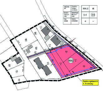 Städtebauliches Ziel dieser Änderungsaufstellung ist die Nutzbarmachung des noch nicht bebauten Gebietsteiles als Innenentwicklung vor Außenentwicklung. Ein barrierefreies und damit seniorengerechtes Wohnen u. a. in einer „Seniorenresidenz“ soll ermöglicht werden. Die Gebietsnutzung als allgemeines Wohngebiet (WA) bleibt bestehen. Die planungsrechtlichen Festsetzungen werden um die Nutzungsschablone „WA 3“ ergänzt. Anzahlung der Vollgeschosse 3, Geschossflächenzahl 0,88, maximale Gebäudehöhe 14,00 Meter. Die Baufenster innerhalb des Änderungsbereichs der 4. Änderung werden angepasst, um die geplante Bebauung zu ermöglichen. Der Investor plant die Errichtung der vorgenannten „Seniorenresidenz“ mit 29 Wohneinheiten und ein Mehrfamilienwohnhaus mit 11 Wohneinheiten.