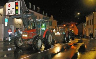 Anlass für die sehr kurzfristig angekündigte Aktion, die nicht die erste in Deutschland war und mit Sicherheit nicht die letzte bleiben wird - „Heute Warm-Up nur“ war auf einem Schild zu lesen, das an einem Traktor befestigt war – waren die Sparbeschlüsse der „Ampel“ in Berlin, die unter anderem den Wegfall der Subvention für Agrardiesel und die Abschaffung der Kraftfahrzeugsteuerfreiheit für landwirtschaftliche Fahrzeuge umfassen. Grommes sprach von einem „Flächenbrand“, der sich nach Weihnachten im ganzen Land ausbreiten werde. Und so waren auch zahlreiche Plakate an den Schleppern zu lesen, die lauteten „Stoppt die Ampel“ oder „Die Ampel muss weg!“
