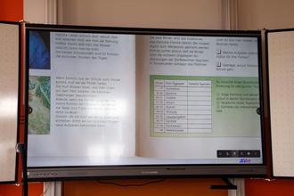 Knippel erläuterte anschließend auch Funktionsweise und Möglichkeiten der modernen Technik. Die Tafel mit klassischem Format kann mit wählbarem Hintergrund (liniert oder kariert) wie eine herkömmliche Tafel genutzt werden. Vorteil: alle Werkzeuge sind integriert und digital verwendbar. Kein Schwamm, keine Kreide, kein Geodreieck oder anderes muss aus dem Schrank geholt werden. Schreiben kann man mit Stift oder Finger. Die klappbaren Seitenteile haben auf Vorder- und Rückseite die Funktion eines Whiteboards. Der große Vorteil bei der Haupttafel sei aber die Multifunktionsfähigkeit bei der Umsetzung von Methodik und Didaktik im Unterricht. Das System funktioniert wie ein hochgerüsteter PC. Die Lehrkraft kann zuhause den Unterricht auf dem Laptop vorbereiten und die Bilder dann auf der Tafel direkt abspielen. Eine Kamera (früher war das ein Epidiaskop) sorgt dafür, dass Bilder von Büchern und Heften auf den Bildschirm übertragen und im Buch eingearbeitete Tabellen auf dem Bildschirm sogar ausgefüllt werden können. Das WLAN stellt sicher, dass man direkt ins Internet schwenken kann und schließlich setzt die integrierte Spracherkennung noch das Sahnehäubchen darauf. Die Schüler können sich über 15 iPads im Unterricht mit dem System verbinden. Der Unterricht sei, so Knippel, aber nicht von der digitalen Technik abhängig. Bücher und Hefte würden mittelfristig (noch) nicht aus der Grundschule verschwinden. (BäR)