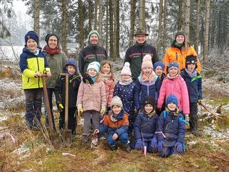 Trotz spätwinterlichem Wetter starteten die Bärenkinder der Kita Gusenburg gut ausgerüstet mit Essen und warmen Getränken zu einem besonderen Einsatz: unter fachlicher Anleitung von Revierförster Jörg Clemens und seinem Team pflanzten die Kinder auf einer Kahlfläche im Gusenburger Wald etwa 80 Bergahorn. Die Setzlinge wurden vorsichtig mit den Wurzelfasern in ein Erdloch gepflanzt und anschließend markiert. Langfristig soll durch dieses Projekt ein Mischwald wachsen, der die Nadelwälder ersetzten soll, die krank waren und daher abgeholzt werden mussten. Die Kinder waren auf diese Waldaktion dank Forstteam gut vorbereitet und wussten daher, dass sich der Borkenkäfer durch die große Trockenheit der letzten Jahre stark vermehrt hat und v.a. Nadelbäume wie Fichten und Tannen schädigt. Die Kinder lernten auch andere Laubbäume wie Flatterulmen, Ess-Kastanien und Trauben-Eichen kennen und durften sogar einen Borkenkäfer unter dem Mikroskop betrachten. Die Kita Gusenburg bedankt sich ganz herzlich bei Revierförster Clemens und seinen Mitarbeitern für die kompetente fachliche und pädagogische Betreuung dieses besonderen Zukunftsprojekts.