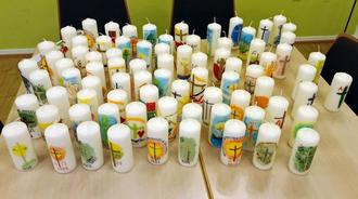 Gemeinsam mit Dorothea Slabschie, die nach der Schließung des Klösterchens in Hermeskeil geblieben ist, haben fleißige Hände auch in diesem Jahr wieder über 70 Osterkerzen gestaltet, die am Palmsonntag (2. April) nach dem Hochamt in der Pfarrkirche St. Martinus zum Verkauf angeboten werden. Der Erlös kommt zu gleichen Teilen der Ukrainehilfe und den Messdienern der Pfarrei St. Franziskus zugute.