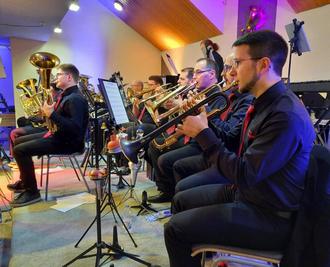 Den zweiten Teil des Abends eröffnete schwungvoll und funkig die „Groove Academy“ von Markus Götz. Die Solopassagen übernehmen zwar normalerweise hier Trompete und Saxophon, der Komponist lässt allerdings ausdrücklich die Option zu, dass auch andere Instrumente diesen Part übernehmen.