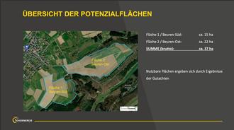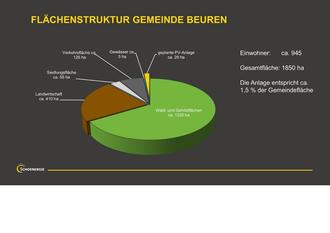 Doch er hat möglicherweise eine Lösung, welche die Bedenken der Landwirte ausräumt und gleichzeitig die Gemeindeeinnahmen erhöht. Denn auch wenn Beuren monetär eher arm ist, ist es reich an eigenen landwirtschaftliche nutzbaren Flächen. Laut Pachtverzeichnis der VG besitzt die Gemeinde Beuren über 40 ha davon. Der Vorschlag: Die landwirtschaftlichen Betriebe tauschen mit der Gemeinde entsprechende Ländereien. Die für das Projekt benötigten und noch fehlenden 15 ha im Potenzialgebiet, könnten so den Eigentümer wechseln. Die Agrarbetriebe werden dann weiterhin Ihrer gewünschten Berufung folgen und Ackerbau betreiben, während die Gemeinde einen höheren Anteil an Pachteinnahmen generiert. (Kö)