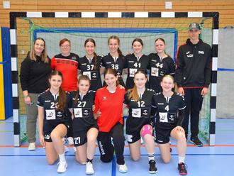 Die Handball-Mädels des TVH mit dem Trainerteam Annabell Michels, Evi Barwe (li) und Tm Regnery (re)