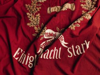 Die Originalfahne wurde erst 1873 in Breslau als Parteifahne geweiht. Sie ziert in der Mitte das Symbol der Arbeiter-Solidarität, die verschlungenen Hände, umgeben von einem Eichenkranz. Heute wird sie im Archiv der sozialen Demokratie in Bonn aufbewahrt. (Foto: Dominik Butzmann)