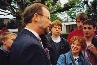 Rudolf Scharping, damaliger Ministerpräsident im Gespräch mit Jugendlichen aus Damflos