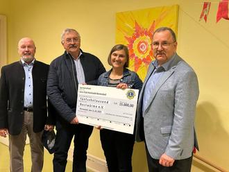 Die Mitglieder des Lions Club Hermeskeil-Hochwald Wolfgang Kaup, Martin Eiden und Präsident Bernd Steup übergeben symbolisch 15.000 Euro an Elisabeth Schuh, 2. Vorsitzende von Nestwärme e.V. Deutschland.