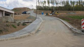 Unser Bild zeigt die neue Straße im Neubaugebiet "In der Pferch". Dort, wo der Bagger steht, befindet sich ein Regenrückhaltebecken. Hinter dem Erdhügel oben links soll später der 3. Bauabschnitt erschlossen werden. Das Bild vermittelt leider nicht, wie steil die Straße sich nach oben windet. Foto: bb