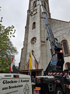 Vor wenigen Wochen wurde bereits am Kirchturm gewerkelt, um Arbeiten am Dach und den Filaltürmchen vorzunehmen. Letzte Woche wurde die Kirchturmuhr repariert.