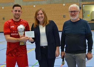 Lena Weber und Reinhard Bäumler überreichten den RuH-Wanderpokal und die Siegprämie an Kapitän Tim Steinmetz (SG Züsch/Neuhütten/Damflos/Hermeskeil).