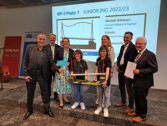 Am 30. März 2023 trafen sich die Juroren, Dr.-Ing. Gerhard Muth, Vorstandsmitglied der Kammer, Prof. Dr.-Ing. Christian Glock von der TU Kaiserslautern und Volker Tschiedel aus dem Bildungsministerium Rheinland-Pfalz zur Bewertung der Modelle in der Geschäftsstelle der Ingenieurkammer Rheinland-Pfalz. Viele Stunden begutachtete, prüfte und bewertete die Wettbewerbsjury alle Modelle und ermittele schließlich die diesjährigen Siegerinnen und Sieger, die sich zur Landespreisverleihung am 5. Mai 2023 im ZDF in Mainz einfanden. Die Brüder Leonard (Klasse 7b) und Raphael (Klasse 5c) Nalbach vom Gymnasium Hermeskeil gewannen den ersten Platz in der Alterskategorie I und nehmen am 16. Juni 2023 am Bundesentscheid im Deutschen Technikmuseum in Berlin teil.