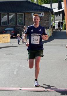 Alexander Bock, Gesamtsieger des 10 km-Laufs, beim Zieleinlauf