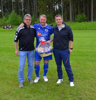 Trainer Jörg Lauer wird von den beiden Vorsitzenden Rainer Thomas (SV Bescheid) und Torsten Hemmes (SC Beuren) verabschiedet