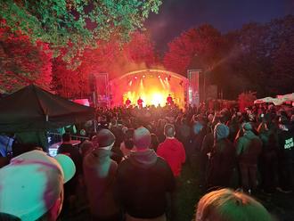 Um 18 Uhr war es endlich soweit, das erste Sauscheid Open-Air wurde durch Bürgermeister Armand Seil und Veranstalter Sebastian Dellwing eröffnet. Sie grüßten die ca. 800 Gäste und Seil versprach eine spektakuläre Überraschung zum Start. Ein Blick nach Oben verriet es dann auch, über dem Burggelände sprangen 4 Fallschirmspringer aus einem Flugzeug ab und kreisten über dem Festivalgelände. Im Anschluss heizte dann die erste Band des Abends, „Whatsename“, mit feinster Greenday Musik die Gäste ein. Nach gut 90 Minuten ging es weiter mit „Thunderbells“, der zweiten Band, die nicht nur musikalisch glänzte, sondern auch eine super Show ihrer Vorbilder AC-DC präsentierte. Die dritte Band des Abends war dann „`TALLICA“, bei der die Gäste von feinstem Metallica-Sound berieselt wurden. Den Abschluss machte die Band „Unter Falscher Flagge“, die das feiernde Publikum nochmal so richtig mit bestem Punk Rock der Toten Hosen einheizte. Die Burganlage an sich bot bereits eine spektakuläre Kulisse für ein solches Festival, als es dann dunkel wurde und die Illumination des Burgturms so richtig zur Geltung kam, war dies natürlich das absolute „Tüpfelchen auf dem i“.
