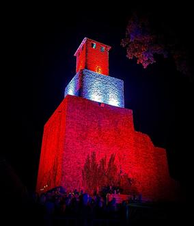 Imposant in Szene gesetzt: Zum Sauscheid Open Air (SOA) wurde auch in diesem Jahr die Grimburg wieder in leuchtendes Licht getaucht und sorgte für das besondere Ambiente auf dem Festival, das am vergangen Samstag bei perfektem Wetter zum zweiten Mal stattfand.