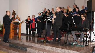 Zu einem 40-minütigen und besonderen Gesangs- und Instrumentalkonzert hatte Dekanatskantor Rafael Klar mit dem Chor TONinTON – verstärkt mit einigen Damen und Herren – am Sonntagabend ins Kulturkloster Hermeskeil eingeladen. Zur Aufführung kam die Jazzkomposition HOPE, Musik John Hoybye, Text Edward Broadbridge. Unterstützt wurden die mehr als 20 Sängerinnen und Sänger von vier hervorragenden Instrumentalsolisten, Nicolas Barbian am Alt-Saxophon, Yoshua Heckmann am E-Piano, David Rauth am E-Bass und Hennig Schütz am Schlagzeug. Das österliche Stück, das in acht Abschnitten vom Leiden und Sterben Jesu Christi in der Osterzeit handelt, wurde in englischer Sprache und ohne jede Pause vorgetragen. Einen besonderen Solo-Part über die ganze Länge des Gesangsvortrags hatte Nicolas Barbian am Saxophon, auch Hennig Schütz am Schlagzeug konnte als Solist begeistern. Den Part der Liturgie hatte Dekan Christian Heinz übernommen. bb