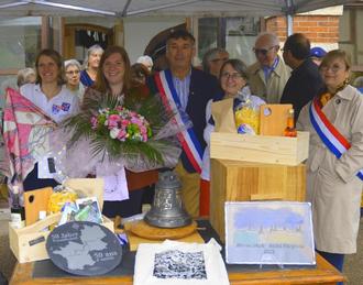 Die Feierlichkeiten zum 50. Jahrestag der Städtepartnerschaften wurden am Samstagmorgen vor dem Rathaus von St. Fargeau durchgeführt. Von den Gastgebern wurde an Stadtbürgermeisterin Lena Weber eine eiserne Miniaturglocke, auf der die Wappen der beiden Städte eingraviert sind, überreicht. Die Stadtbürgermeisterin übergab an ihren Amtskollegen Dominique Charpentier eine Schiefertafel, auf der die Umrisse von Frankreich und Deutschland und die etwa 500 km lange Strecke zwischen Hermeskeil und St. Fargeau abgebildet sind. Als kulinarischen Gruß übergab sie einen Schlemmerkorb mit Produkten von „Ebbes von hei“. An die beiden Vorsitzenden der Partnerschaftsvereine Brigitte Jacquot und Corinna Schneider wurden Gemälde von Ursula Stimmler mit einem Hermeskeiler Motiv übergeben.