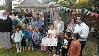 Gleich zwei Tage hintereinander erlebten die Kinder der Hermeskeiler KiTa Adolph Kolping vergangene Woche etwas Besonderes. Am Donnerstag waren sie in den Garten des Pfarrhauses an der Martinuskirche gekommen, um vier Hühner zu begrüßen, die hier seit Kurzem in einem großzügigen Gehege mit Hühnerstall leben. Schon vor längerer Zeit hatte sich das Team um Leiterin Katja Ludes Hühner für die KiTa gewünscht und gemeinsam mit Pastor Christian Heinz fand man den geeigneten Standort am Pfarrhaus. Die Finanzierung des Projekts wurde durch die erfolgreiche Teilnahme an einem Wettbewerb gesichert, den die Firma ESDG aus Freiburg anlässlich ihres 15-jährigen Bestehens ausgeschrieben hatte. ESDG ist ein Energieversorger für kirchliche und soziale Einrichtungen und auch für das Bistum Trier tätig. Zwei Vertreter des Unternehmens waren eigens nach Hermeskeil gekommen, um symbolisch den Scheck über 5000 Euro zu überreichen (s. Foto). Pastor Heinz segnete die Hühner und betete für ein gutes Gelingen des Projekts. KiTa-Leiterin Ludes dankte allen, die zum Gelingen beigetragen hatte, darunter namentlich Väter aus der Elternschaft und dem Förderverein, die den Aufbau der Anlagen übernommen hatten.
