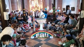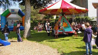 Auch der folgende Freitag hatte den KiTa-Kindern etwas ganz Ungewöhnliches zu bieten. In St. Martinus wurden sieben Kinder getauft, darunter fünf, die bereits die KiTa besuchen. Der Raum um den Taufstein der Kirche bot dabei ein ungewohnt buntes Bild (s. Foto). Doch dieses für viele Kinder beeindruckende Ereignis war noch nicht alles. Denn im Anschluss ging es in die KiTa, wo nicht nur die Familien der Taufkinder, sondern alle KiTa-Kinder bis in den Nachmittag hinein mit einer kleinen Kirmes feiern durften. Außer dem Karussell, das letztes Jahr schon einmal an der KiTa stand, gab es auch noch eine Hüpfburg, eine Grillstation, einen Crêpes-Stand sowie Popcorn und kleinere Kirmes-Einrichtungen, an denen sich die Kinder vergnügen konnten.