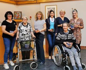 Präsentieren bepflanzte Blumengefäße v..li. Marion Adams (Stadtbücherei), Karina Düpre-Kranz, Sandra Cäsar (beide (MGH), Dorethee Kupczik (Leitung pastorale Dienste, Corina Arm (Altenheim St. Klara mit zwei Bewohnern
