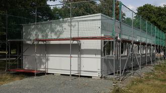 Noch ist der Container eingerüstet, die Außenanlagen sind noch nicht gemacht. Auch soll auf das Bauwerk ein Dach aufgebracht werden. Ob ein rechtzeitiger Bezug Anfang September möglich sein wird, bleibt abzuwarten.