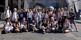 Den Abschluss bildete ein Besuch in Trier, vor der Porta Nigra stellt sich die Klasse dem Fotografen zu einem Gruppenfoto.