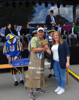 Lena Weber übergibt an ihren Nachfolger Christoph König den Holzhammer um den Fassanstich vorzunehmen.