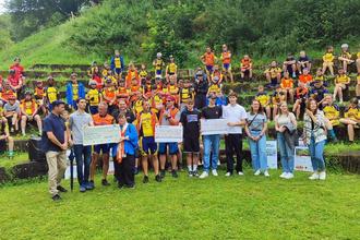 Durch vier Abiturienten, darunter auch zwei ehemalige Fairplay-Tourteilnehmer, Oberstufenlehrerin Aline Bohr sowie die begleitenden Lehrer Luise Staadt und Teamleiter Freddy Uder wurden die Schecks beim Mittagsstop am letzten Tourtag in der Arena der Burg in Dhronecken an den Geschäftsführer der Sportakademie, Klaus Klären, übergeben. Anschließend machte sich das Team auf zur die Zieleinfahrt in Trier. Damit ging eine erfolgreiche Tourwoche nach 500 Km bei bestem Wetter zu Ende. Auf dem Foto außerdem zu sehen: Vertreter der VG Thalfang, der OG Dhronecken, Margit Gellner von der Komage in Kell, die das Team seit Jahren unterstützt und Trikotsponsor Michael Kläser von HWH.