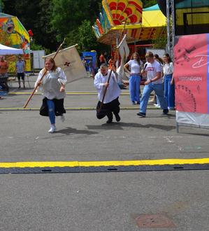 Den krönenden Abschluss bildete ein Wettlauf mit den altbekannten Fahnen der Messdiener, der dank des hervorragenden Technikers mit epischer Musik untermalt wurde. Da Christian Heinz laut Einschätzung der Jury einige „illegale Abkürzungen“ genommen hatte und Lena Weber dennoch als Erste die Ziellinie überquerte, ging auch dieser Punkt an die Bürgermeisterin. Damit gewann Lena Weber das Duell „Don Camillo und Peppona“ und sorgte für einen Ausgleich zu dem Sieg des Pastors im letzten Jahr.