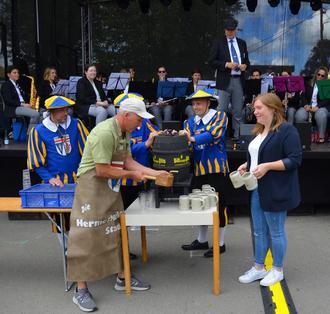Der neu gewählte Stadtbürgermeister Christoph König schlägt das Faß an, die noch amtierende Bürgermeisterin Lena Weber wartet mit den Bierkrügen lauf den kühlen Gerstensaft.