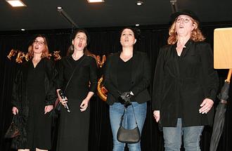 Zwischendurch und im Anschluss an die Reden sorgte der Quartettverein „Concordia“ mit Liedbeiträgen durch die Formationen Gemischter Chor und Männerchor für musikalische Unterhaltung. Sowohl gesanglich wie auch choreografisch vermittelten sie den Zuhörern modernen Chorgesang. Dass in den aktiven Sängerinnen und Sängern auch ein gerütteltes Maß an schauspielerischen Fähigkeiten steckt, bewiesen sie auch beim Auftritt der „vier schwarzen Witwen“ und dem Märchen „Aschenputtel àla Quartettverein“. Andrea Stüber, Astrid Weist, Britta Fischer und Inge Kirsten vermittelten bei ersterem gesanglich in „Leichenbittermiene“, mit welchen Methoden – als Unfall getarnt – sie ihre ungeliebten Ehemänner ins Jenseits befördert hatten. Beim Aschenputtel Sketch fungierte Hildegard Eiden als Erzählerin. Die Märchenfiguren (Prinz: Herbert Eiden, Aschenputtel: Mathilde Leisen, Fee: Rita Philipps, hässliche Schwestern: Christel Hüther und Inge Schömer) tauchten dabei immer wieder wie Puppen eines Puppentheaters hinter einem Paravant auf, um ihre teilweise nur aus einem Wort bestehenden Beiträge abzugeben. Zwischendurch und im Anschluss nutzten die Gäste die Zeit für intensive Gespräche. (BäR)