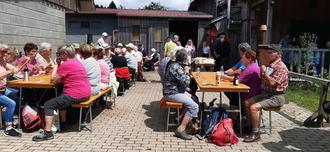 Als Strecke hatten Valerie Dengler und das Team der Touristinformation einen ca. 9 km langen Rundkurs um Grimburg und Gusenburg ausgesucht. Auch Petrus hatte an diesem Tag ein Einsehen und verschonte die fröhlichen Wanderer mit Regengüssen. Als Begrüßung hatten die Musiker dieses mal nicht das obligatorische Lied aus der Operette der Vogelhändler „Grüß euch Gott...“ ausgewählt, sondern quasi als „Animation“ das Lied „Auf, auf ihr Wandersleut...“. Das ließen die sich nicht zweimal sagen. Nach einigen Wanderliedern in der angenehm frischen Morgenluft und einem ersten Schluck „Stimmöl“ ging es unter der Leitung von Ricarda Ahmetovic auf die Strecke. Die führte in weitem Bogen über die Grimburger und Gusenburger Flur über zwei Singstationen zur „High Forest Ranch“ nach Gusenburg, wo Mittagsrast eingelegt wurde. Mitten zwischen den Pferdegattern genossen die Wanderer die Gastfreundschaft und die tolle Versorgung durch die Familie Ratzka. Die Musiker dankten der mit dem Lied „Es hängt ein Pferdehalfter an der Wand...“ bevor man zum zweiten Teil der Strecke aufbrach. Die führte über die Großmann Kapelle und die Grenderich Kapelle mit jeweils einem Singstopp zurück zum Bürgerhaus nach Grimburg. Nach dem offiziellen Ende bei dem sich Ricarda Ahmetovic (TI) und Reinhard Bäumler (RuH) bei allen Beteiligten herzlich für die gelungene Veranstaltung bedankten, überreichte man den Akteuren eine Tüte mit flüssiger und fester Nahrung. Nach dem „Bajazzo“ als kleine musikalische Zugabe löste sich die Wander-/Singgemeinschaft gegen 16 Uhr auf, jedoch nicht ohne das vielseitige Versprechen, im nächsten Jahr wieder dabei zu sein. (BäR)