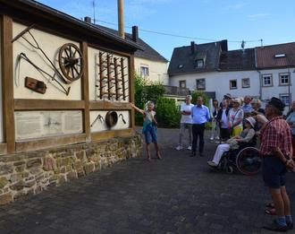 Die Führung mit den etwa 30 interessierten Wanderern begann vor der Sparkasse, wo „Der Hermeskeiler“ eine gusseiserne Statue aufgestellt ist, die Vater Tochter und Sohn darstellen. Von da aus ging es zum Rathausbrunnen, mit seinen 13 wasserspeienden Armen, die den Wasserreichtum von Hermeskeil und Umgebung sowie die 13 Ortsgemeinden der Verbandsgemeinde symbolisieren sollen. Die Wanderung führte die Gruppe zum Keiler, ein früheres Wahrzeichen der Hochwaldkaserne, der die Bedeutung von Hermeskeil als ehemalige Garnisonsstadt versinnbildlichen soll. Über den Krankenhausgarten, der u.a. von Ulrike Kann gepflegt wird, ging es weiter zum „Mäschecken“, dem ältesten Teil der Stadt, dem ehemaligen Unterdorf. Der Mäschecken war ein Kommunikationszentrum der Hermeskeiler Bürger. Sie trafen sich dort zum „mäjen“, was im Plattdeutsch „miteinander quatschen“ bedeutet. Weiter ging es vorbei am Mehrgenerationenhaus zur Menora-Tafel, dem Standort der früheren Synagoge, die in der Reichskristallnacht von den Nationalsozialisten verwüstet und 1945 durch Artillerie-Beschuss zerstört wurde.