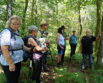 Um Grenzen ging es von Beginn an. Bereits um 10 Uhr stach die Sonne vom strahlend blauen Himmel, den kein Wölkchen trübte. Es würde ein heißer Tag werden. Glücklich, wer mit Kopfbedeckung und ausreichend Wasser versorgt war. So startete die kleine Gruppe von Gusenburg in Richtung Benkelberg und das angrenzende Saarland. Rainer Peter, der bereits seit 12 Jahren als Wander- und Gästeführer in der Verbandsgemeinde aktiv ist, war in seinem Element. Die erste Station machte er bereits bei den Windparks, die diesseits und jenseits der Landesgrenze „wie Spargel“ in den Himmel wachsen. Mit seiner genauen geografischen Kenntnis ordnete er die Windräder mühelos den Gemarkungen beiderseits der Landesgrenzen zu. Bei der Leistung der Anlagen ging es um ingenieurstechnische Grenzüberwindungen, die bei den frühen Anlagen noch geringer waren als heute. Auf dem Weg nach Sitzerath wich Peter immer wieder vom Waldweg ab und zeigte den interessierten Wanderern bemerkenswerte Landschaftsformungen, die sich als menschengemacht herausstellten. So wies er auf ein Abbaugebiet der sogenannten „Lebacher Eier“ hin, die aufgrund ihrer Form und ihres hohen Eisengehalts oberirdisch abgebaut wurden. „Die Holzschubkarren waren mindestens genauso schwer wie das abtransportierte Material“, wusste Peter die Mühen früherer Handarbeit anschaulich zu berichten. In der fast zugewachsenen Kuhle äsen heute tierische Waldbewohner, was den Ort zu einem bevorzugten Jagdgebiet macht. An einer anderen Abbaustelle der Lebacher Eier im Saarland hat man den Ablauf gedämmt, so dass dort ein Weiher entstanden ist. Nach der Mittagspause in Sitzerath, wo Peter auf die Beschaffenheit des Quarzsandsteins eingegangen ist, hat die Gruppe das einem Kraterfeld gleichende Abbaugebiet von Mahlsteinen erforscht, das ebenfalls nur wenige Meter abseits der Wegegrenzen in Oberlöstern sichtbar wurde. Der Wald war auch Ressource für die hiesige Gerberindustrie. Mit Loh-Hecken, einem jungen Eichenbestand, der alle 25 Jahre gerodet wurde, wurde das Gerbmittel „Lohe“ hergestellt, um Tierfelle haltbar zu machen. Diese Hecken zeichnen sich durch einen dichten Bestand ohne große Einzelbäume aus. Der Rückweg führte in einer kontinuierlichen Steigung wieder den Benkelberg hinauf, was bei den Temperaturen auch einer Grenzerfahrung nahekam. Pünktlich um 16 Uhr erreichten die mit neuen Blickwinkeln bereicherten Wanderer nach etwas mehr als 13 Kilometern Wegstrecke den Kirchplatz in Gusenburg, wo sich alle einig waren. Rainer Peter hatte eine Grenzen erweiternde Wanderung mit vielen interessanten Fakten zur wirtschaftlichen und kulturhistorischen Geschichte des Schwarzwälder Hochwalds angeboten. Und die Tourist-Information den gewohnt professionellen organisatorischen Rahmen. (TB)