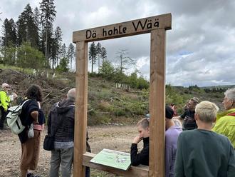 Was die Klimakrise dann mit dem Wald anrichtet, wusste Jörg Clemens im weiteren Verlauf der Wanderung zu berichten. Die niederschlagsarmen Jahre hatten zuletzt zu einer starken Vermehrung des Borkenkäfers geführt, sodass die Fichtenbestände an der Prims doch stark gelitten haben. Auf Damfloser Seite lud der Rastplatz an der Bruder-Klaus-Kapelle zu einer kurzen Pause ein. Der Storywalk hatte wieder eine neue Geschichte parat ehe man das Gewässer wieder Richtung Hermeskeil auf einer neuen Brücke überquerte.