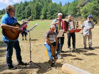 Trotz oder gerade wegen der Corona-bedingten Zwangspause in den letzten beiden Jahren waren wieder über 50 sangesfreudige Wanderer nach Naurath/Wald gekommen, um an der inzwischen zum Renner gewordenen Mittwochswanderung teilzunehmen. Doch auch die musikalischen Begleiter hatten sich irgendwie vermehrt. So gesellten sich zum Sänger/Koordinator Reinhard Bäumler und Urgestein Heinz Reinert am Akkordeon noch die beiden Brüder des letzteren, die den Gitarren- und den Rhythmuspart übernahmen und Verbandsbürgermeister Hartmut Heck, der 2019 schon an dieser Veranstaltung Feuer gefangen, stieg diesmal aktiv als zweiter Akkordeonspieler mit ein.