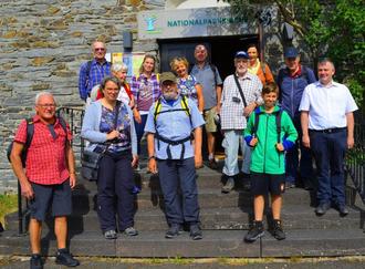 Die Wandergruppe zusammen mit Pastor Christian Heinz (re) und Pastoralreferentin Gerlinde Paulus-Linn (2.v.li) am Beginn der Wanderung vor der Nationalparkkirche