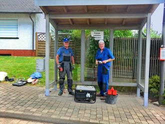 Das Bushaltehäuschen am Ortsausgang von Gusenburg in Richtung Hermeskeil bedarf des Öfteren einer Rostsanierung. Die Ursache hierfür ist, dass das Wartehäuschen unmittelbar an der Hauptstraße steht, im Winterdienst werfen die Streufahrzeuge auch Streusalz in das Wartehäuschen und gegen die Stahlkonstruktion, die dadurch korrosionsanfällig wird. Die Schaffbuxen Edgar Giebel und Erich Backes haben es sich zum Ziel gesetzt, den korrosionsanfälligen Unterbau des Wartehäuschens nachhaltig mit einem speziellen Rostschutzanstrich zu sanieren.