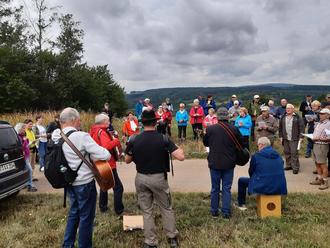 63 sangesfreudige Wanderer hatten sich am Erholungsgebiet Pflanzgarten in Hermeskeil eingefunden, um an der inzwischen zum Renner gewordenen Mittwochswanderung teilzunehmen. Auch die musikalischen Begleiter hatten sich noch einmal vermehrt. So gesellten sich zum Sänger/Koordinator Reinhard Bäumler und Urgestein Heinz Reinert am Akkordeon noch die beiden Brüder des letzteren, die den Gitarren- und den Rhythmuspart übernahmen, Verbandsbürgermeister Hartmut Heck als zweiter Akkordeonspieler und Bernd Willems als weiterer Gitarrist.