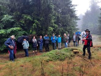 Die letzte Wanderung der RuH-Wanderwoche fand am Freitag statt, sie führte von der Köhlerhütte in Neuhütten über die „Dollbergschleife“, durch den Nationalpark Hunsrück-Hochwald hin zum keltischen Ringwall bei Otzenhausen, weiter am Stausee Nonnweiler vorbei zum Industriedenkmal „Züscher Hammer“ und zurück zum Ausgangspunkt. Unter fachkundiger Leitung von Nationalparkführer Norbert Hoff wanderten die 18 Frauen und Männer bei leichtem Regen durch Buchen- und Fichtenwälder, wobei Norbert Hoff die Waldwirtschaft des Naturparks erläuterte. Sehr anschaulich konnten die Wanderer die Schäden begutachten, die der Borkenkäfer an den Fichtenstämmen anrichtet. Teilweise wird dieses Holz entnommen, teilweise lässt man es auch als Totholzfläche stehen. Am keltischen Ringwall gab es einen Einblick in die Geschichte dieser gewaltigen Festungsanlage der Kelten. Die Befestigung, die als Fliehburg diente, wurde ab 700 vor Christus errichtet und nachdem Cäsar mit seinen Truppen in Gallien einmarschiert war, 50 vor Christus verlassen. Die Kelten, die zum Stamm der Treverer zählten, beherrschten bereits die Eisenverhüttung und fertigten aus dem gewonnenen Eisen Waffen und Geräte für die Landwirtschaft, so Hoff. Nach dem recht anspruchsvollen Abstieg ins Tal ging es am Stausee Nonnweiler entlang hin zum Industriedenkmal „Züscher Hammer“. Hier fand eine Besichtigung statt. Leider ist die Anlage derzeit defekt und muss aufwändig instandgesetzt werden. Nach der Ankunft an der Köhlerhütte saßen die Wanderer noch gemütlich zusammen und stärkten sich mit einem kleinen Imbiss und Getränken. Bernd Willems, Geschäftsführer von „Rund um Hermeskeil“ bedankte sich bei Valerie Dengler, Leiterin der Tourist-Information, für die gut organisierte Wanderwoche und gab der Hoffnung Ausdruck, dass diese auch in 2024 wieder stattfinden wird. bb