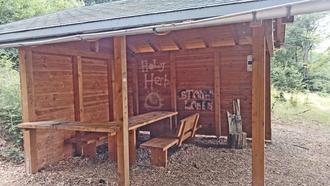 Die Wanderlieder-Tour der RuH-Wanderwoche führte auch an der Schutzhütte im Steinerwald vorbei. Erst vor ein paar Monaten mussten die Tischplatte und die Ablagefläche erneuert worden, weil sie stark angekohlt waren. Doch auch die erneuerten Teile weisen schon wieder Brandflecken auf. Zudem sind die Wände mit blödsinnigen „Botschaften“ verunziert und die Dachrinne hat unter dem Übermut vermutlich betrunkener Zeitgenossen stark gelitten. Wanderer, zu deren Schutz diese Hütte mit EU-Mitteln errichtet wurde, sind für diese Beschädigungen mit größter Wahrscheinlichkeit nicht verantwortlich. Es ist traurig, dass so mit gemeinschaftlichem Eigentum umgegangen wird!